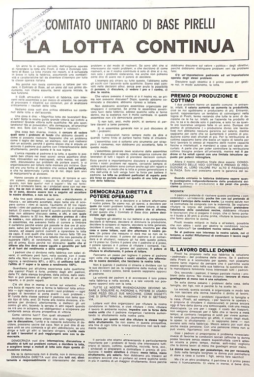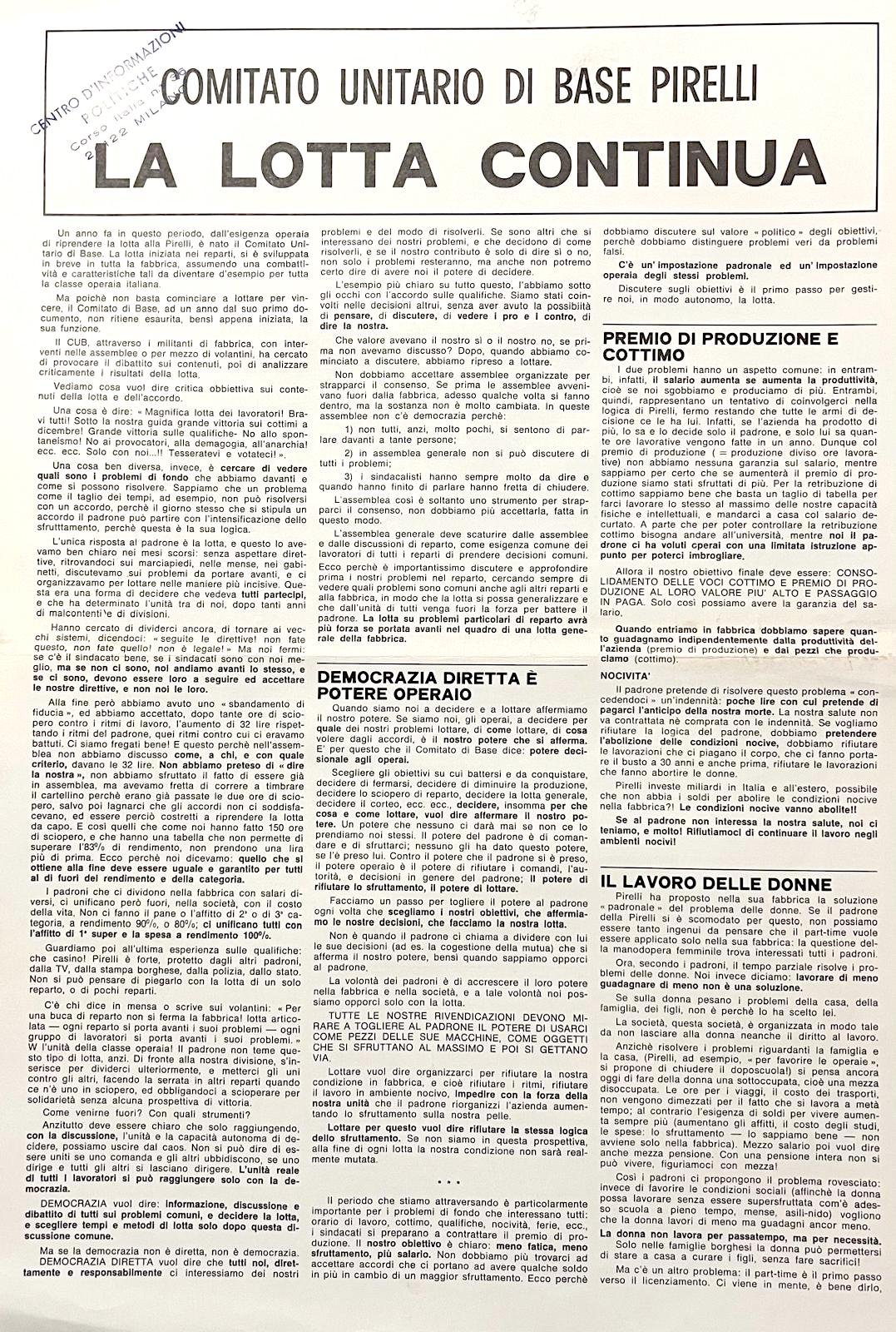 La posizione del CUB Pirelli sulle lotte da perseguire: democrazia diretta, la difesa del lavoro delle donne, il problema dei lavoratori studenti, l'orario di lavoro e in generale la necessità di legare l'aspetto economico e quello politico, costruendo l'unità operaia e popolare. In ottimo stato