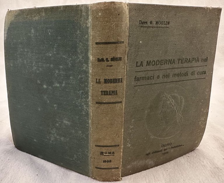 Edizione del 1908 di questo manuale di terapia medica di Moglie. Lista delle sostanze in ordine alfabetico, descrizione delle proprietà fisio terapeutiche posologia. Alla fine tavole dosimetriche e farmacologiche. In buone condizioni. Copertina in tela editoriale in buone condizioni generali con lievi usure ai margini e dorso. Legatura in buone condizioni. Pagine in buone condizioni con rare fioriture. In 16. cm 14,5x10,5 cm. Pp. IV+356+XXVIII.Edition of 1908 of this manual of medical therapy by Moglie. List of substances in alphabetical order, description of physio therapeutical properties and posology. At th end charts with measures. In good conditions. Cloth editorial cover in good general conditions lightly worn in the extremities. Binding in good conditions. Inside pages are in good conditions with occasional foxing. In 16. cm 14,5x10,5 cm. Pp. IV+356+XXVIII.