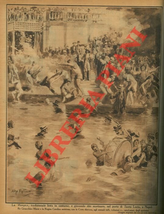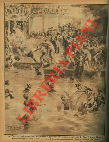 La 'Nzegna, tradizionale festa in costume, e giocondo rito marinaro, nel porto di Santa Lucia, a Napoli. Re Gioacchino Murat e la Regina Carolina assistono, con la Corte sfarzosa, agli annuali tuffi, volontari e.involontari, degli spettatori. | Rare and modern books | Matania Ugo