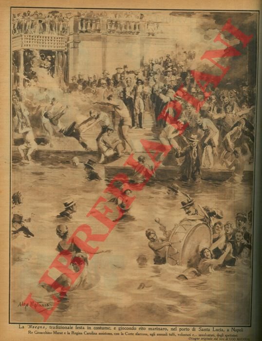 La 'Nzegna, tradizionale festa in costume, e giocondo rito marinaro, nel porto di Santa Lucia, a Napoli. Re Gioacchino Murat e la Regina Carolina assistono, con la Corte sfarzosa, agli annuali tuffi, volontari e.involontari, degli spettatori.