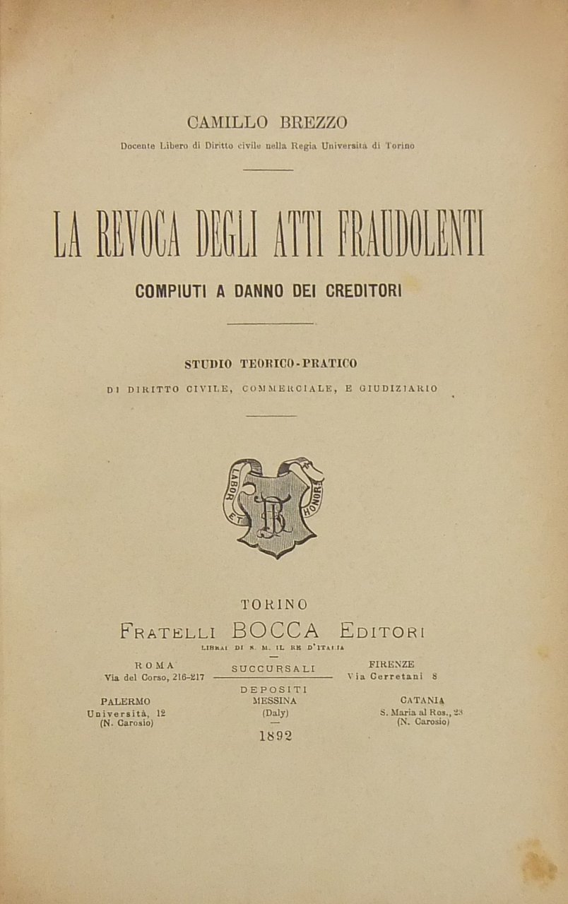 La revoca degli atti fraudolenti compiuti a danno dei creditori. Studio teorico-pratico di diritto civile commerciale e giudiziario | Rare and modern books | Brezzo Camillo