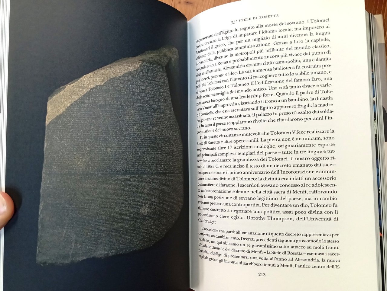 Volume in copertina rigida con sovraccoperta, 732 pagine con illustrazioni a colori lungo l'intero testo. Copia in perfette condizioni -- Se il tentativo di restituire un periodo o un personaggio storico attraverso una mostra ha sempre qualcosa dell'azzardo, per l'idea di raccontare la storia della civiltà umana sulla Terra attraverso 100 oggetti - da una pietra da taglio abbandonata in Tanzania due milioni di anni fa a una carta di credito islamica emessa nel 2009 - mancano le definizioni. Eppure Neil MacGregor non solo ha raccolto la sfida, ma le ha aggiunto un ulteriore gradiente di difficoltà: ha cioè pensato di descrivere i 100 oggetti, tutti provenienti dalle collezioni del British, alla radio, in altrettante puntate da un quarto d'ora l'una trasmesse tre anni fa dalla BBC. E, per farlo, ha sostituito alle immagini un numero equivalente di storie, raccontate con la sua voce, ma anche lasciando la parola a una folla di studiosi, esperti, artisti. Risultato? Un successo enorme che ha incoraggiato MacGregor a trasformare tutto il materiale trasmesso in ciò che, in filigrana, era già: questo libro. Che adesso si può aprire come un'enciclopedia, leggere come un romanzo, o visitare come una Wunderkammer - un personalissimo museo portatile da percorrere una stanza dopo l'altra, seguendo le connessioni che la nostra guida di volta in volta ci indica, oppure stabilendone di nostre, attraverso il tempo e lo spazio: finché le rifrazioni di questa stupefacente macchina ottica non ci costringeranno a vedere anche il presente con occhi diversi.