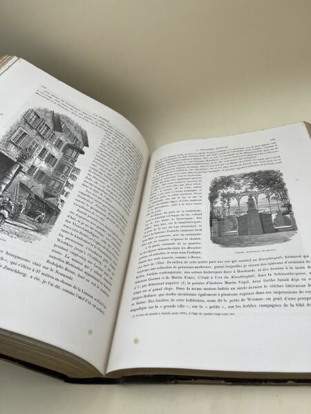 Librairie Hachette et Cie 1880 Librairie Hachette et Cie, 1879. 2 Volumes in-4 carrés reliés demi-chrgrin chocolat, dos nerfs, titre doré. 714 + 722 pages. Première Partie : Genève, Vaud, Valais, Berne, Unterwalden, Lucerne, Zoug, Schwitz, Uri. Deuxième Partie : ri, Tessin, Grisons, Glaris, Saint-Gall, Appenzell, Thurgovie, Schaffhouse, Zurich, Argovie, Bale, Soleure, Fribourg, Neuchatel.ouvrage illustré de 750 gravures sur bois. Légères rousseurs par endroit, sinon bon état