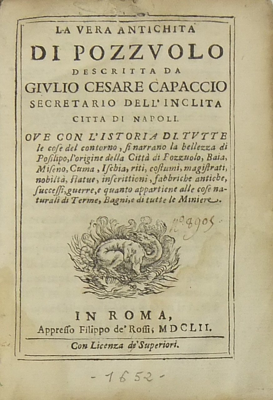 La vera antichita di Pozzuolo descritta da Giulio Cesare Capaccio secretario dell'inclita citta di Napoli. Ove con l'istoria di tutte le cose del contorno si narrano la bellezza di Posillipo l'origine della Città di Pozzuolo Baia Miseno Cuma Ischia riti costumi magistrati nobiltà statue inscrittioni fabbriche antiche successi guerre e quanto appartiene alle cose naturali di Terme Bagni e di tutte le Miniere