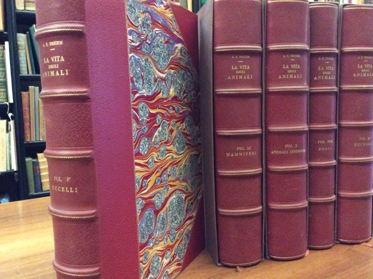In-8 gr., 10 volumi, mz. pelle, titolo impresso in oro al dorso, pp. compl. 7770, con una importante documentazione iconografica (come da Indice) di: 1809 illustrazioni in bianco e nero nel testo, 192 tavole fuori testo di cui 97 sono bellissime cromolitografie, oltre a 12 carte geografiche a colori. <br>L'opera del grande naturalista tedesco (1829-1884) è cosi' suddivisa: Mammiferi, 3 volumi - Uccelli, 3 volumi - Rettili. Anfibi - Pesci - Insetti. Miriapodi. Aracnidi - Animali inferiori. Ebbe larghissima diffusione, fu tradotta nelle principali lingue, ed ha anche un notevole valore scientifico oltre che divulgativo.<br>Con qualche fioritura ma certamente un buon esemplare.