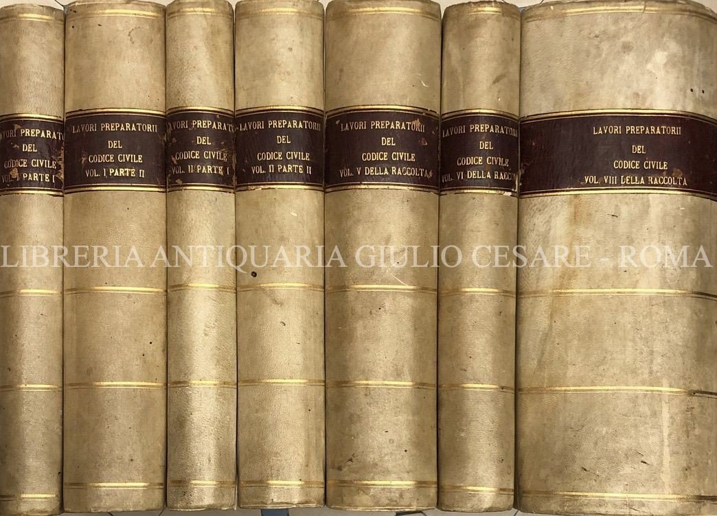 Lavori preparatorii del Codice civile del Regno d'Italia. Vol. I,1 - Studi e documenti parlamentari relativi al progetto di legge sul matrimonio; Vol. I,2 - Documenti parlamentari relativi al progetto di legge per regolare il contratto civile di matrimonio ed a quello per la tenuta degli atti dello stato civile; Vol. II,1 - Progetto di revisione del Codice civile Albertino presentato al Parlamento dal Ministro di Grazia e Giustizia G.B. Cassinis; Vol. II,2 - Progetto di revisione del Codice civile Albertino presentato al Parlamento dal Ministro di Grazia e Giustizia G.B. Cassinis il 19 giigno 1860, e sunto delle osservazioni fattevi dalla Magistratura; Vol. V - Osservazioni della Magistratura sul progetto di revisione del Codice civile | Rare and modern books | Regno D'Italia (1861-1946)