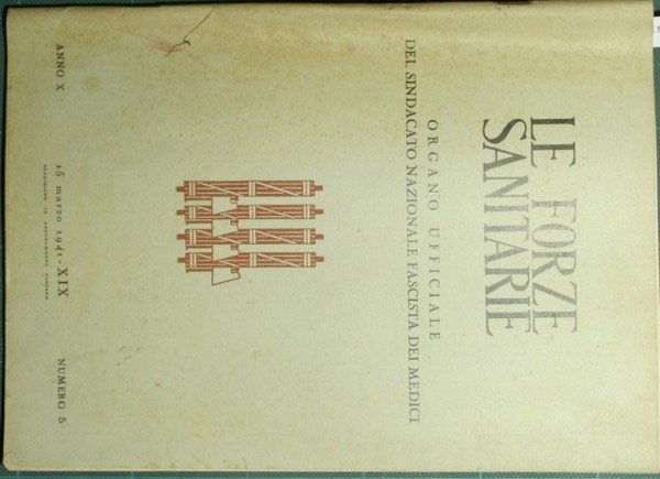 Organo ufficiale del Sindacato Nazionale Fascista dei medici - Direttore Sen. Prof. Raffaele Bastianelli - Collana Le forze sanitarie. Pubblicazione quindicinale. Nn. 5/8-15-16-18-19-22-24 - in 8° - pp.70 pp. Ca. a fascicolo - Brossura editoriale illustrata - Dieci fascicoli - Immagini in b/n nel testo e fuori testo, illustrazioni a colori fuori testo - Testo su due colonne - Annata scompleta - N. 5: 15 Marzo / N. 24: 31 Dicembre