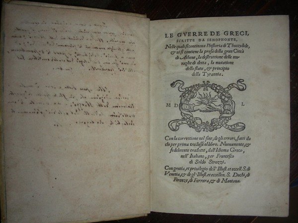 LE GUERRE DE GRECI scritte da. Nelle quali si continua l’historia di Thuccydide, & vi si contiene la presa della gran Città di Athene, la destruttione delle muraglie di detta, la mutazione dello stato, & principio della Tyrannia. Con la correttione nel fine, de gli errori, fatti da chi per prima tradusse el libro. Nuovamente & fedelmente tradotte, dall’Idioma Greco, nell’Italiano, per Francesco di Soldo Strozzi.
