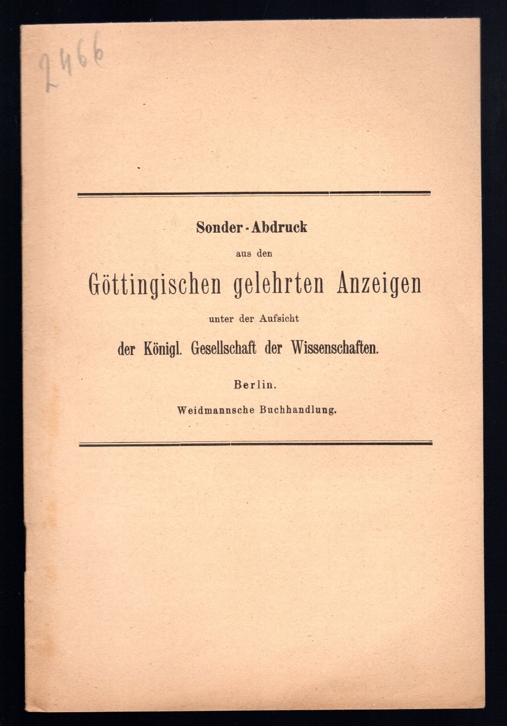 Opuscolo vintage in-8° con 24 pagg, Berlino. Saggi. testo in lingua tedesca. Estratto da Gottingischen gelehrten Anzeigen. Note a matita in copertina.