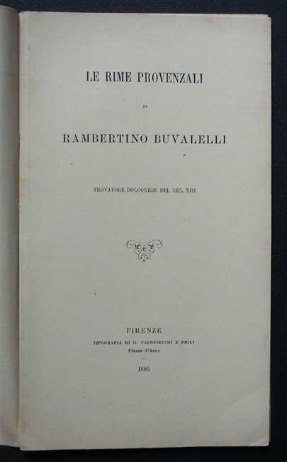LE RIME PROVENZALI di… Trovatore Bolognese del secolo XIII. | Rare and modern books | Buvalelli Rambertino.