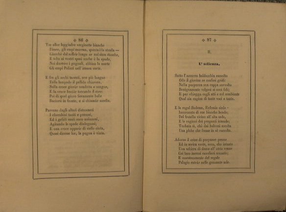 in 16° - pp.330 - Carta - Esemplare in barbe - La copertina e la prima carta presentano un lungo strappo ma senza mancanze - esemplare sciupato - Legatura allentata - Lo scrittore fin dalla sua giovinezza svolge un´importante attività di promotore culturale. Come poeta sperimenta vari generi dalla ballata romantica, con le Leggende e Ispirazioni, pubblicate all´epoca non solo in Italia, ma anche a Parigi e a Madrid, alla lirica vera e propria, con varie raccolte, fra cui Fede e dolore, ai testi per musica sacra, di grande risonanza, sappiamo che fino al secondo dopoguerra ancora si cantavano nelle chiese di Messina le sestine bisazziane Al sangue di Cristo. Ma Felice Bisazza non era solo uno scrittore, docente di Letteratura Italiana nell´Università di Messina, è ricordato da suoi famosi allievi, quali Annibale Maria di Francia, come un insegnante amatissimo e dalla grande capacità didattica. Un intellettuale così noto non poteva non essere socio di varie Accademie letterarie, non solo siciliane; bisogna però puntualizzare che l´attività di Bisazza non si esplica solo in campo umanistico, anzi lo scrittore era anche Segretario perpetuo della società economica di Messina, un importante istituto creato da Ferdinando II per promuovere lo sviluppo del settore agricolo e artigianale.