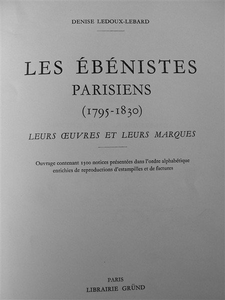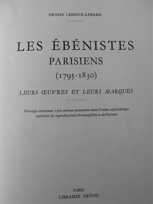 LES EBENISTES PARISIENS (1795-1830). Leurs oeuvres et leurs marques. Ouvrage contenant 1500 notices presentèes dans l’ordre alphabetique enrichies de reproductions d’estampilles et de factures. | Rare and modern books | Ledoux-Lebard.
