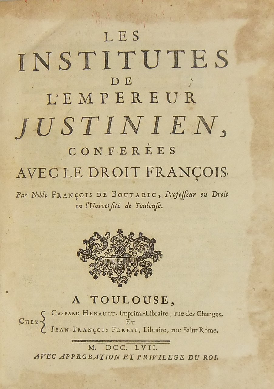 Les institutes de l'Empereur Justinian, conferees avec le droit francais | Rare and modern books | De Boutaric Francois