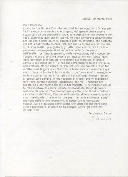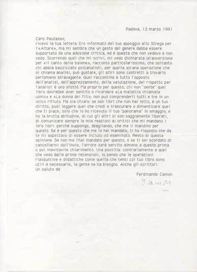 AUTOGRAFO Scambio epistolare tra lo scrittore di Montagnana e Pautasso a proposito del premio “Strega” (il volume “Un altare per la madre”, Garzanti 1978) e di alcune opinioni del critico nei confronti di alcune opere di Camon, tra cui “Il canto delle balene”, Garzanti, 1989). “[.] Ero informato del tuo appoggio allo strega per l’Altare”. [.] mi vedo dichiarata un’avversione per “Il canto delle balene”, racconto particolarissimo, che soltanto chi abbia bazzicato psicanalisti [.] può gustare” (lettera di Camon). “[.] Più che ad accordi formali preferisco un dibattito sostanziale come questo, e mi auguro che non si arresti. Continuiamo entrambi a lavorare, sia pure con diverse finalità [.] e avremo altre occasioni di confronto-scontro, insisto, dialettico [.] (Risposta Pautasso).