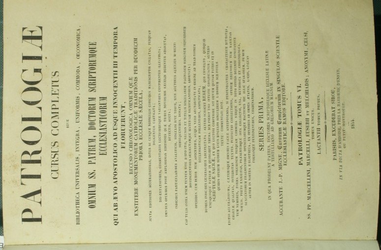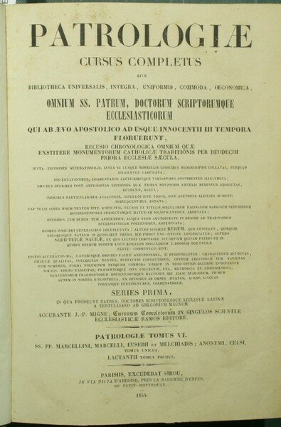 Editio novissima quae omnium instar esse potest, ad octoginta et amplius mss. codices editosque quadraginta collata notisque uberioribus illustrata - Praecedunt S. Marcellini papae, S. Marcelli papae, S. Eusebii papae, S. Melchiadis papae, Anonymi, Celsi, omnia quae extant fragmenta - Collana Patrologiae cursus completus, sive bibliotheca universalis, integra, uniformis, commoda, oeconomica, omnium SS. Patrum, doctorum scriptorumque ecclesiasticorum. Vol. VI e VII - in 4° - pp.1100; 1204 (numerazione a colonna) - Tela con titolo e fregi in oro al dorso - Due volumi in un tomo - Testo su due colonne - Fioriture in qualche pagina