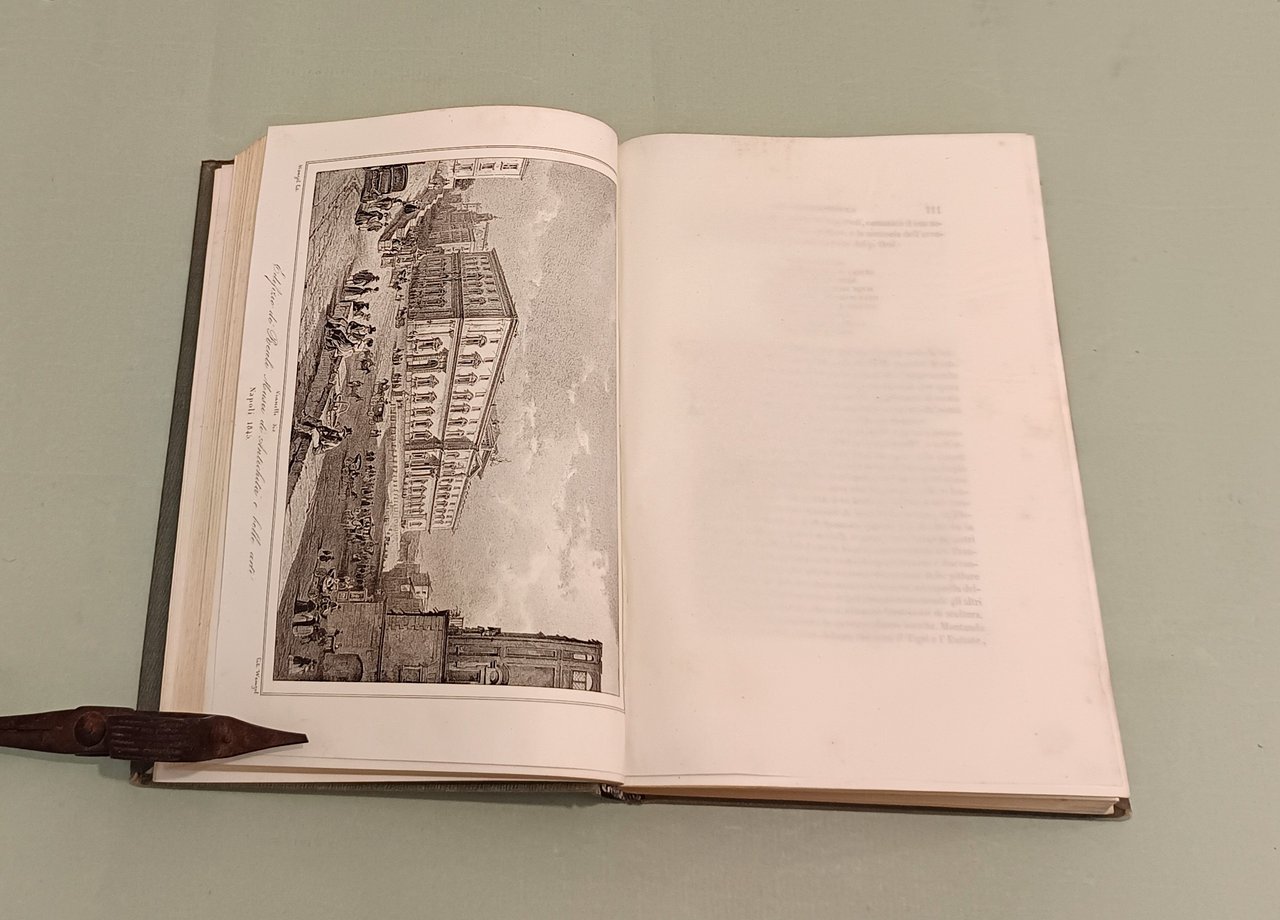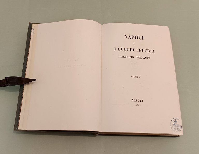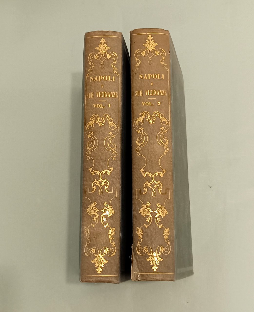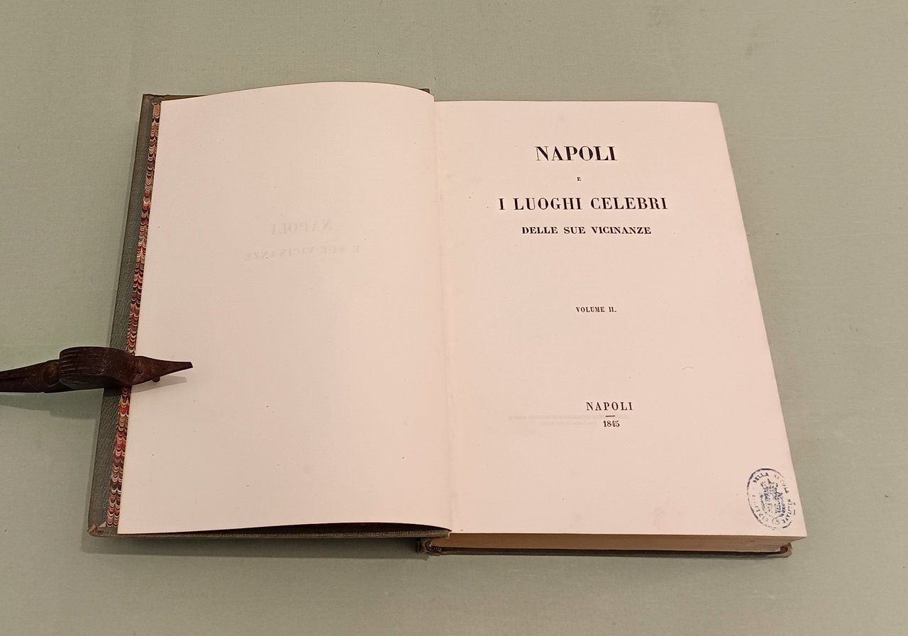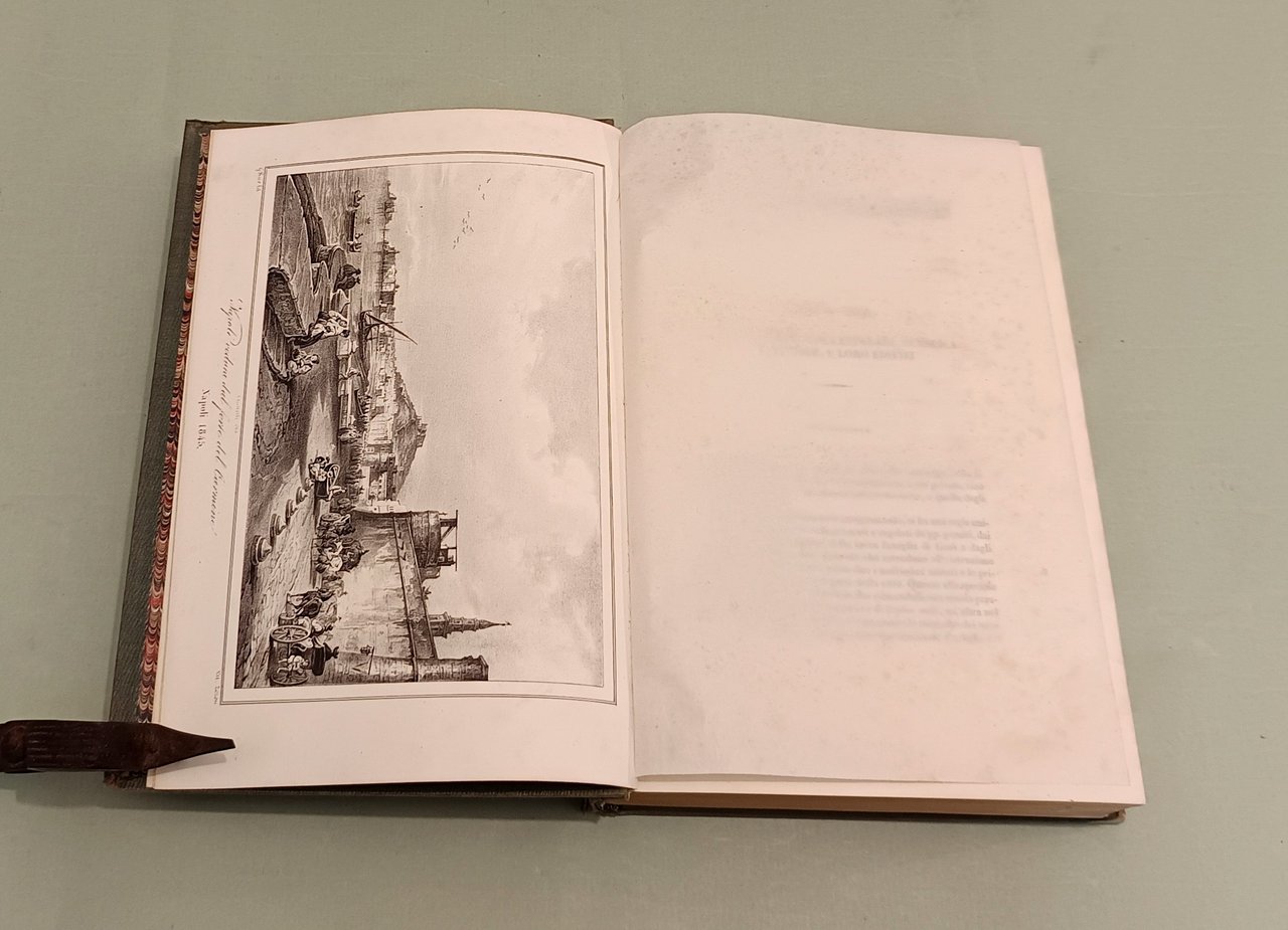 Napoli e i luoghi celebri delle sue vicinanze. Napoli, Nobile, 1845. Due volumi in 4to; pp. 12n.nn., 542; 602, 22, 1 con indice delle tavole. 3 grandi tavole spieghevoli: carta della Città di Napoli, carta dei Contorni di Napoli, carta di Pompei e 25 tavole disegnate da Achille Vianelli e Giacinto Gigante e litografate da Wenzel e Zezon. Le tavole protette da veline. Esemplare in perfette condizioni. Opera pubblicata in occasione del Settimo Congresso Scientifico degli Italiani. Scritti di Stanislao d'Aloe, Raffaele D'Ambra, Mariano d'Ayala, Carlo Bonucci, Cesare Dalbono, Francesco Puoti, Bernardo Quaranta. Bella legatura coeva in tutta tela con fregi in oro di gusto romantico ai dorsi, piatti inquadrati da fregio a secco.