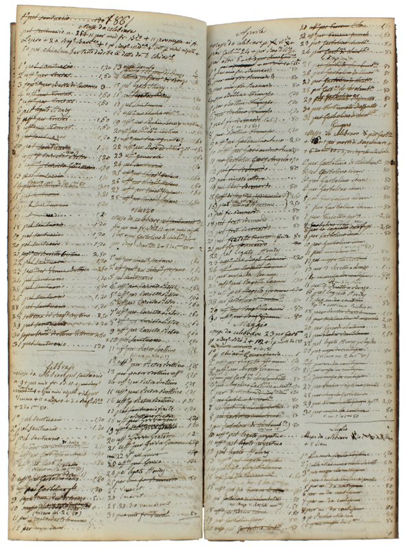 (Codice NB/0004) Registro originale in folio stretto (cm 41x15 circa), 92 pp. Ordinate note giornaliere/mensili su 2 colonne scritte a penna dalla stessa mano per quasi un trentennio: anni 1846-1874. L'A., sacerdote, vi annotava con cura le messe celebrate (Torino), i committenti/beneficiari e i relativi compensi. Chiara grafia ben leggibile. Cancellature, macchiette, ingialliture. Legatura mezza pergamena, dorso in parte fessurato ma solido, etichetta in carta al piatto. Ottimo stato. ~~~ SPEDIZIONE IN ITALIA SEMPRE TRACCIATA