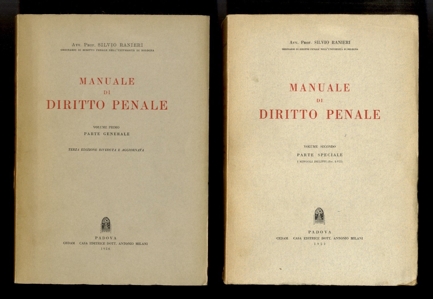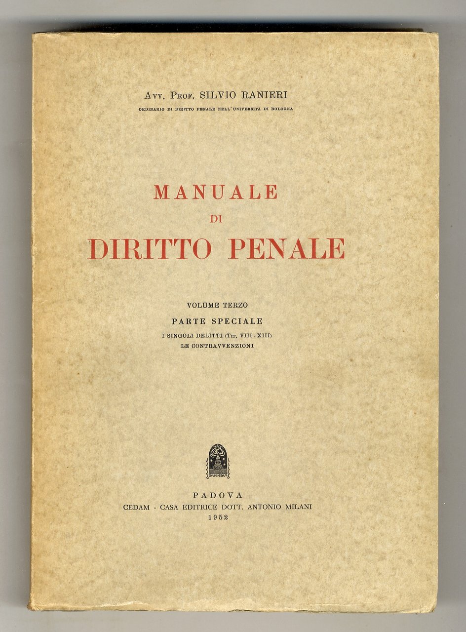 Manuale di diritto penale. Volume primo: parte generale. Volume secondo: Parte speciale, i singoli delitti (Tit. I-VII). Volume terzo: Parte speciale. I singoli delitti (Tit. VIII-XIII). Le contravvenzioni. | Rare and modern books | Ranieri Silvio.