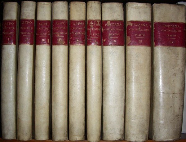 9 voll. in folio, bella legatura uniforme ottocentesca in mezza pergamena con tasselli in pelle e titoli oro ai dorsi, angoli. Bel ritratto dell’Affò in antiporta al primo volume, protetto da velina, inciso in rame da F. Rosaspina su disegno di J. Turchi. Fontamentale e insuperabile lavoro, fatica del Padre Affò (Busseto 1741 – Parma 1797) cui dedicò molti anni di studio e ricerca, contiene le biografie e opere degli scrittori parmigiani, in ordine cronologico, fino alla fine del XVII secoli, anche scrittori meno noti, minori o “che per soverchia modestia nulla composero o le cui opere furono trascurate e consunte” (dall’ ”Avviso a chi legge”). L’opera fu dedicata a Ferdinando di Borbone, Duca di Parma Piacenza e Guastalla. L’Affò, minore osservante, storico ed erudito, fu per anni bibliotecario della Palatina di Parma. A lui si deve anche una incompiuta storia della città di Parma e una storia di Guastalla. La continuazione dell’opera, nel secolo successivo, è dovuta ad Angelo Pezzana (Parma 1772-1862) che la dedica a Maria Luigia Duchessa di Parma, e contiene anche un’ampia biografia dell’Affò con il catalogo delle opere edite ed inedite. Pezzana fu anche bibliotecario della Palatina e valido bibliografo, nonchè direttore della Gazzetta di Parma, ma soprattutto i sui studi ebbero applicazioni sulle opere dell’Affò che si impegnò ad ampliare e portare a termine. Pregevole copia della più importante e attendibile opera sugli scrittori parmigiani, nell’insieme completo dei 4 volumi aggiuntivi del Pezzana e in elegante legatura uniforme. Splendido esempl. in barbe.