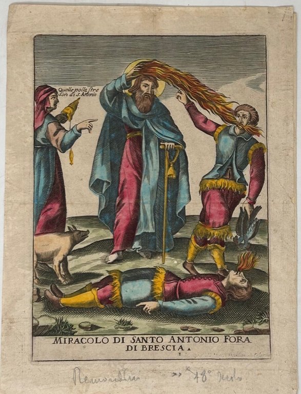 >Incisione in rame (225x170 e margini) acquerellata da mano coeva, titolo su due righe posto nella parte inferiore del rame. L'immagine raffigura Santo Antonio noto anche come "l'Eremita", connotato dal bastone da eremita con campanello e un maiale al suo fianco. Il Santo è raffigurato mentre compie il miracolo legato del fuoco. Le fiamme sembrano sprigionarsi dalle bocche di due uomini, uno a terra e uno in piedi, mentre il santo interviene. Al fianco sinistro del Santo, una donna con vicino un maiale, dice: "Quelle pollastre son di S. Antonio".
