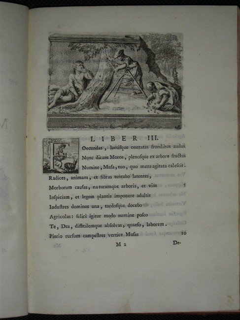 in-4 antico, pp. (8), 186, 1 cb, belliss. leg. p. pelle coeva con cornici in oro e picc. ferri ai piatti, tit. oro e fregi al d. con nervi, riguardi in carta dec., tagli rossi. Belliss. vignetta in rame al front. Testat. inc. in rame da D. Lorenzi su dis. di F. Lorenzi che precede la dedicatoria a Massimiliano Giuseppe. Graziose iniz. animate in rame e altre 6 gr. incis. in rame n.t. da D. Valesio e G. D. Cignaroli. Rara operetta dedicata alla pianta del gelso composta dal nobile veronese (1717-1782): sarà poi tradotta in italiano nel 1792 dal figlio Leonardo ma non più impreziosita dalle incisioni di ottima fattura. Ottimo esempl. su carta forte e a pieni margini, in elegante leg. [083]