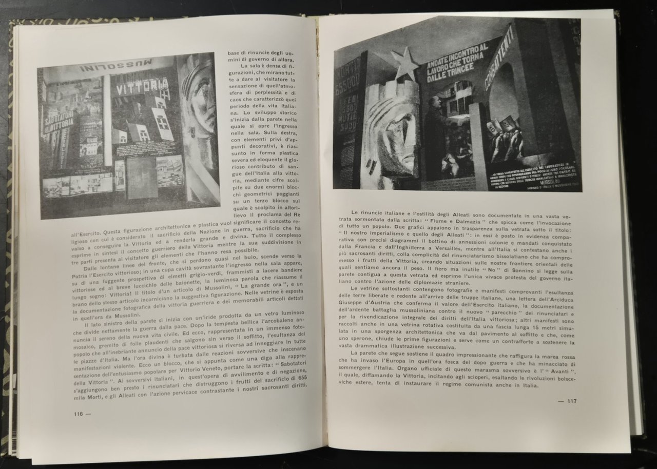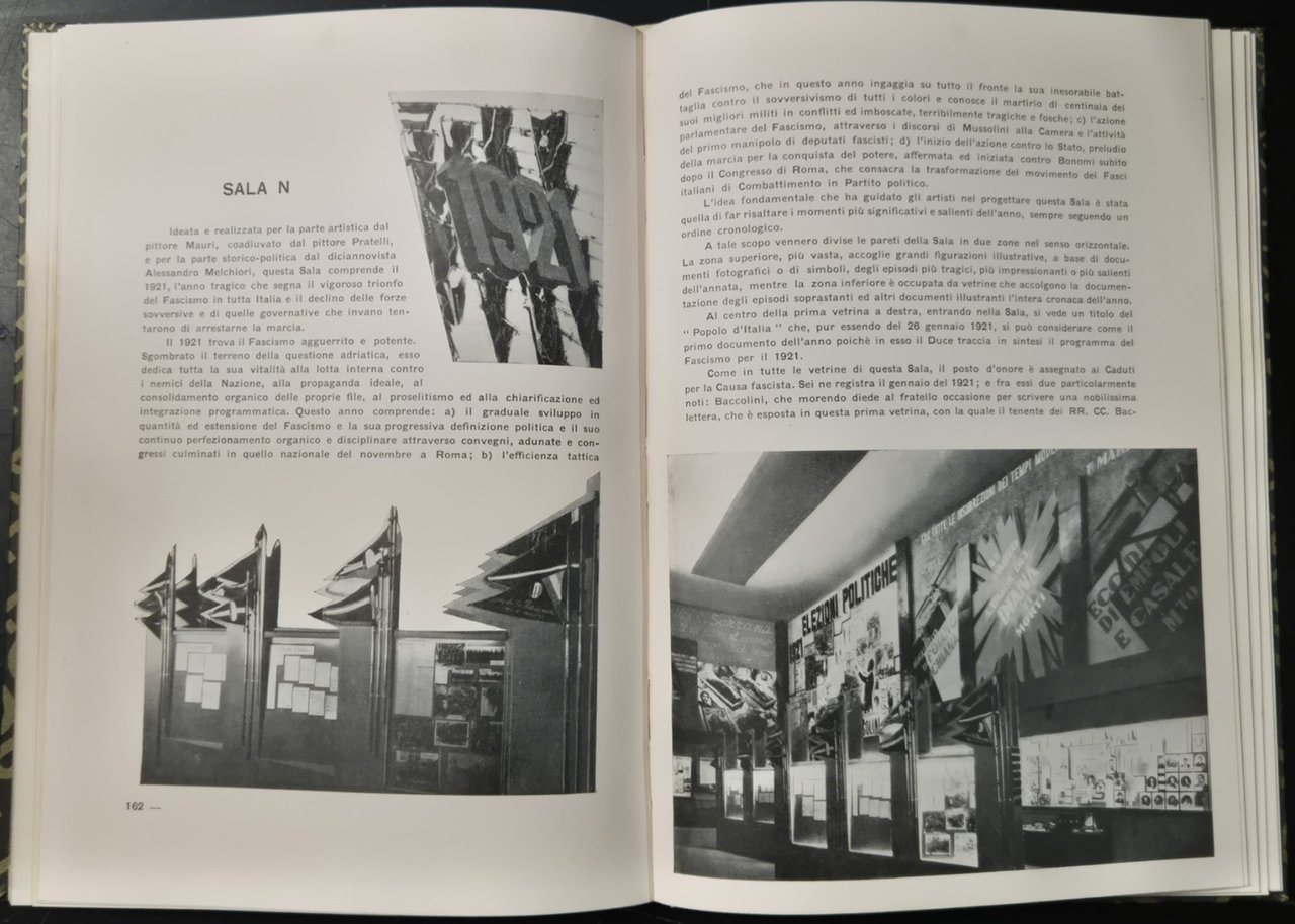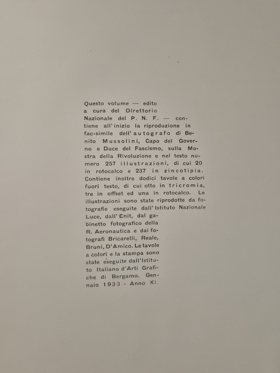 MOSTRA DELLA RIVOLUZIONE FASCISTA I decennale della marcia su Roma. Partito Nazionale Fascista, Istituto Italiano d'Arti Grafiche, Bergamo, 1933. 262 pagine. 257 illustrazioni in bianco e nero nel testo; 12 tavole a colori fuori testo. Copertina editoriale in mezza tela con piatti in cartone illustrati a colori su grafica di Mario Sironi. Stato di conservazione: molto buono (pagine normalmente ingiallite).