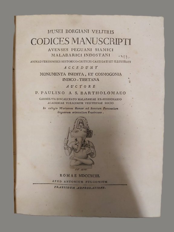 MUSEI BORGIANI VELITRIS CODICES MANUSCRIPTI Avenses, Peguani, Siamici, Malabarici, Indostani animadversionibus Historico-criticis castigati et illustrati accedutn Monumenta inedita et cosmogonia Indico-Tibetana auctore… | Rare and modern books | Paolino Di S. Bartolomeo [Vezdin Ivan Filip].