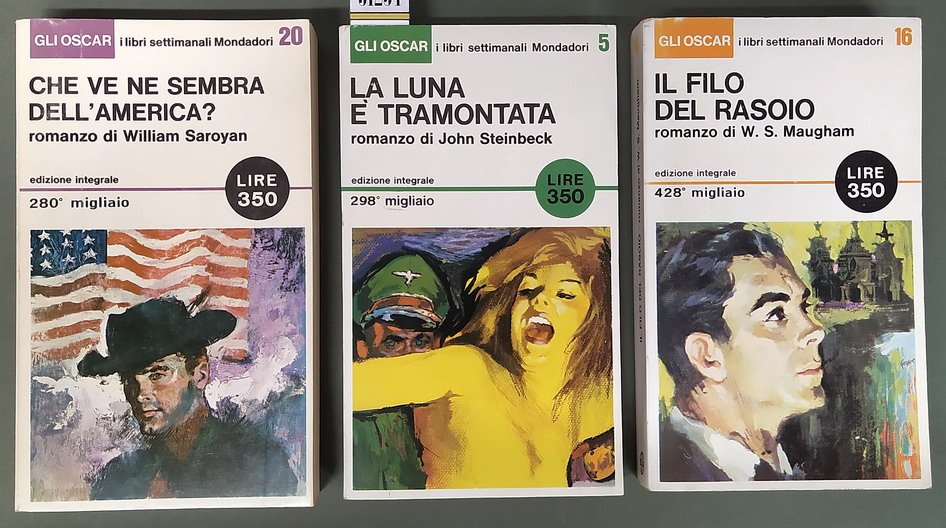 Edizione: descrizione dei libri della collana oscar settimanali: 1) la luna e' tramontata (john steinbeck), traduzione di giorgio monicelli, pp. 237, (3), iii. edizione: giugno 1965 (n. 5) - 2) che ve ne sembra dell'america (william saroyan), traduzione di elio vittorini, pp. 343, (7), i. edizione: settembre 1965 (n. 20) - 3) il filo del rasoio (w. s. maugham), traduzione di maria martone, pp. 335, (1), i. edizione agosto 1965 (n. 16).