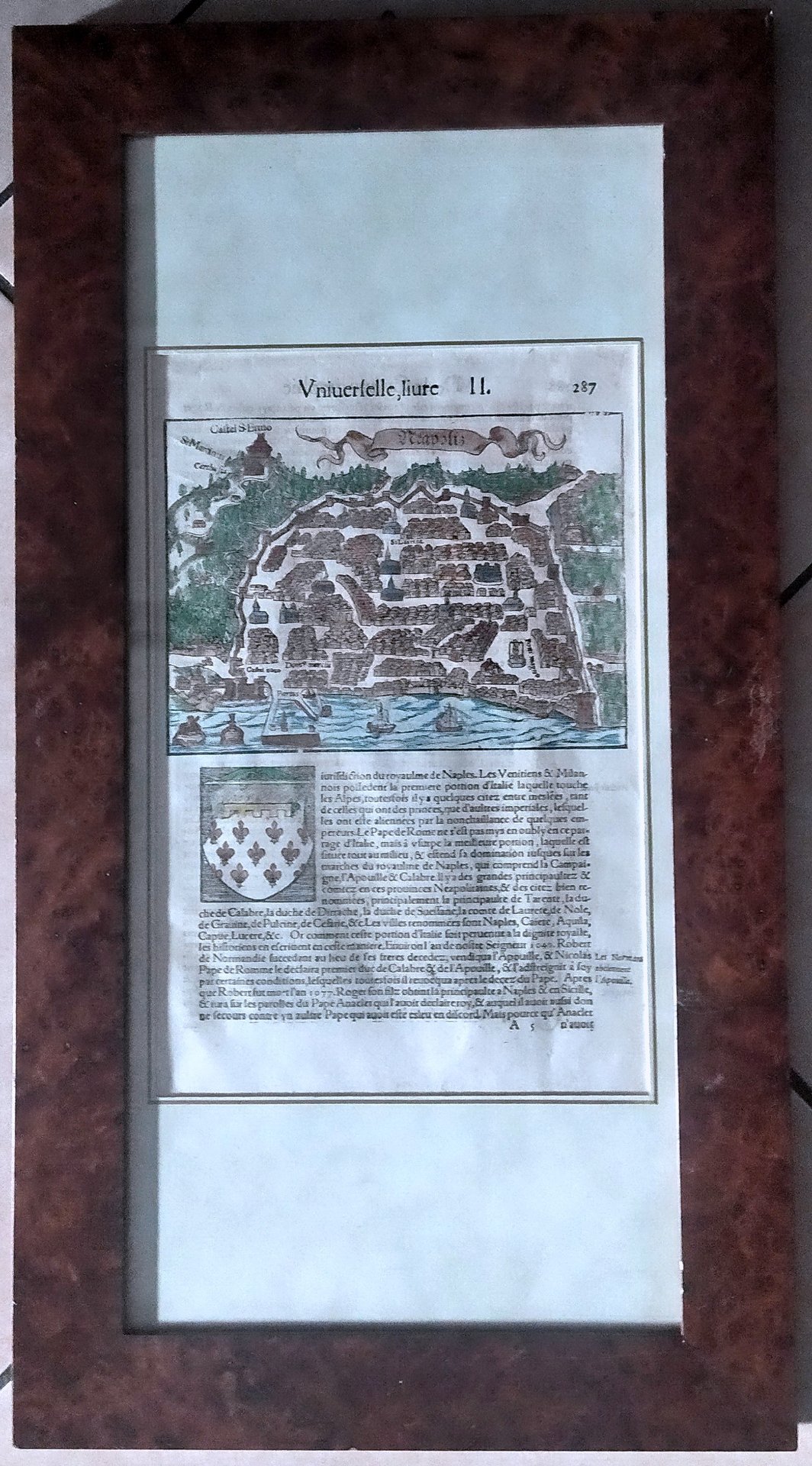 Incisione silografica con acquerellatura non coeva dim. foglio con testo L. 20 x 33 cm. (L. 18 x 13,5 cm. la parte incisa e colorata). In buono stato di conservazione - In cornice massello di noce (dim. L. 30 x 55 cm.).
