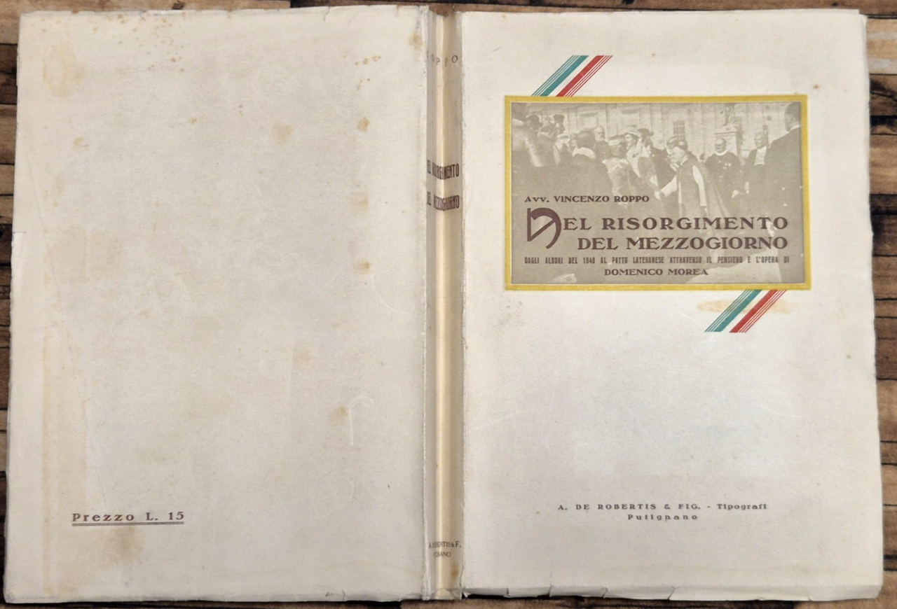 NEL RISORGIMENTO DEL MEZZOGIORNO di Vincenzo Roppo. Dagli albori del 1848 al Patto Lateranese attraverso il pensiero e l'opera di Domenico Morea. A. De Robertis & Fig. Tipografi, 1931. XX, 335 Pagine, 45 illustrazioni in bicromia fuori testo. Copertina editoriale in brossura. Stato di conservazione: molto buono (pagine normalmente ingiallite, copertina con segni d'uso).