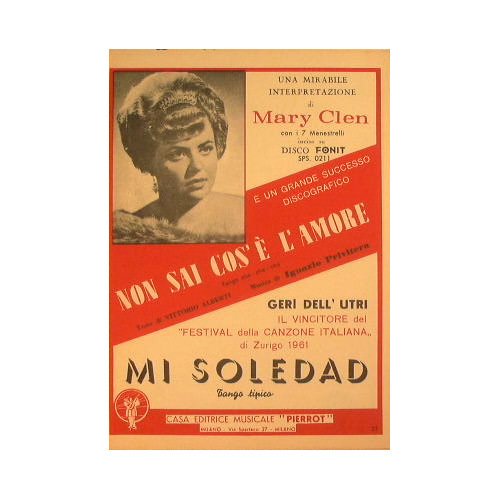 Un interpretazione di Mary Clean con i 7 Menestrelli - Un successo Discografico - Il vincitore del ' Festival della Canzone Italiana di Zurigo 1961 ' - in 8° - pp.13 - Brossura editoriale illustrata - Partitura per Pianoforte, Violini, Fisarmonica e Contrabbasso/Chitarra