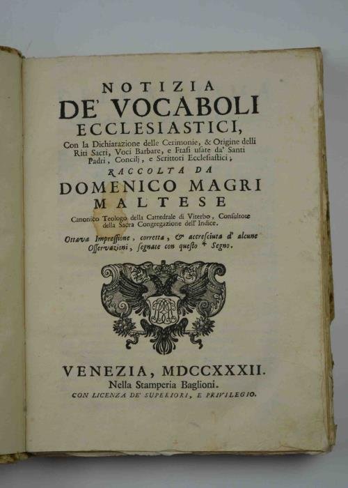 Notizia de' vocaboli ecclesiastici, con la Dichiarazione delle Cerimonie, et Origine delli Riti Sacri, Voci Barbare, e Frasi usate da' Santi Padri, Concilj, e Scrittori Ecclesiastici… Ottava impressione, corretta, et accresciuta d'alcune Osservazioni… | Rare and modern books | Magri Domenico (Maltese).