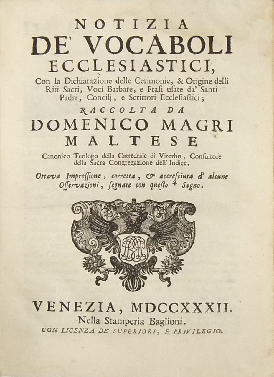 Notizia de' vocaboli ecclesiastici, con la Dichiarazione delle Cerimonie, et Origine delli Riti Sacri, Voci Barbare, e Frasi usate da' Santi Padri, Concilj, e Scrittori Ecclesiastici | Rare and modern books | Magri Maltese Domenico (1604-1672)
