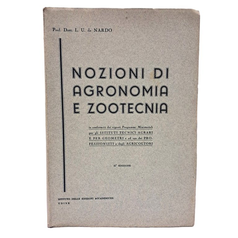 Seconda edizione per gli istituti tecnici agrari e per geometri ed ad uso dei professionisti e degli agricoltori Nozioni di Agronomia e Zootecnia" di L.U. De Nardo è un testo storico di riferimento, pubblicato in più edizioni tra il 1938 e il 1947 da editori come Istituto delle Edizioni Accademiche e Del Bianco. Il manuale, spesso in due volumi, copre le tecniche agricole e zootecniche in linea con i programmi ministeriali dell'epoca per istituti tecnici, periti e agricoltori. In brossura. Pp. 515. Ottime condizioni, ancora intonso.