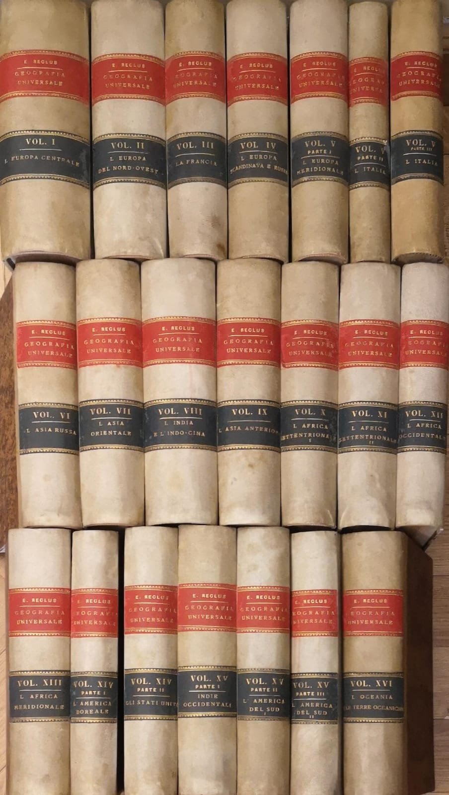 In-8 gr. (mm. 260x185), 16 volumi in 21 tomi, mezza pergamena coeva, titolo (in tassello) e fregi oro al dorso, pp. complessive 20.039. Riccamente illustrato da 105 cartine in cromolitografia fuori dal testo (qualcuna anche ripiegata); 3527 cartine nel testo (molte di citta' ed una sui possedimenti italiani in Eritrea e regioni limitrofe) e 1701 meravigliose incisioni su legno a piena pagina di vedute di citta'. Imponente opera completa di geografia universale con numerosissime informazioni fornite riguardo alla geografia vera e propria, alla descrizione di razze e popoli, alletnografia, alla situazione politica ed economica delle diverse regioni. In piu' flora, fauna ed ambiente naturale. L'opera e' completa di tutte le sue parti e di tutte le tavole, cartine, incisioni e pagine. I primi due volumi sono esemplari leggermente fioriti, peraltro il resto dellopera è in buono stato di conservazione.