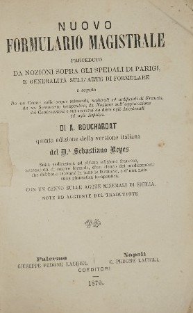 Preceduto da nozioni sopra gli spedali di Parigi, e generalità sull'arte di formulare - E seguito da un Cenno sulle acque minerali, naturali ed artificiali di Francia, da un Sommario terapeutico, da Nozioni sull'applicazione dei Controveleni e sui socccorsi da dare agli Avvelenati ed agli Asfittici - in 16° - pp.688 - Tela muta - Tracce d'umidità alla legatura quasi interamente staccata, primo fascicolo staccato, segni a penna ai fogli di guardia - Quinta edizione della versione italiana del Dr. Sebastiano Reyes sulla sedicesima ed ultima edizione francese, accresciuta di nuove formole, d'un elenco dei medicamenti che debbono trovarsi in tutte le farmacie, e d'una nota sulla ginnastica terapeutica. Con un cenno sulle acque minerali di Sicilia, note ed aggiunte del traduttore