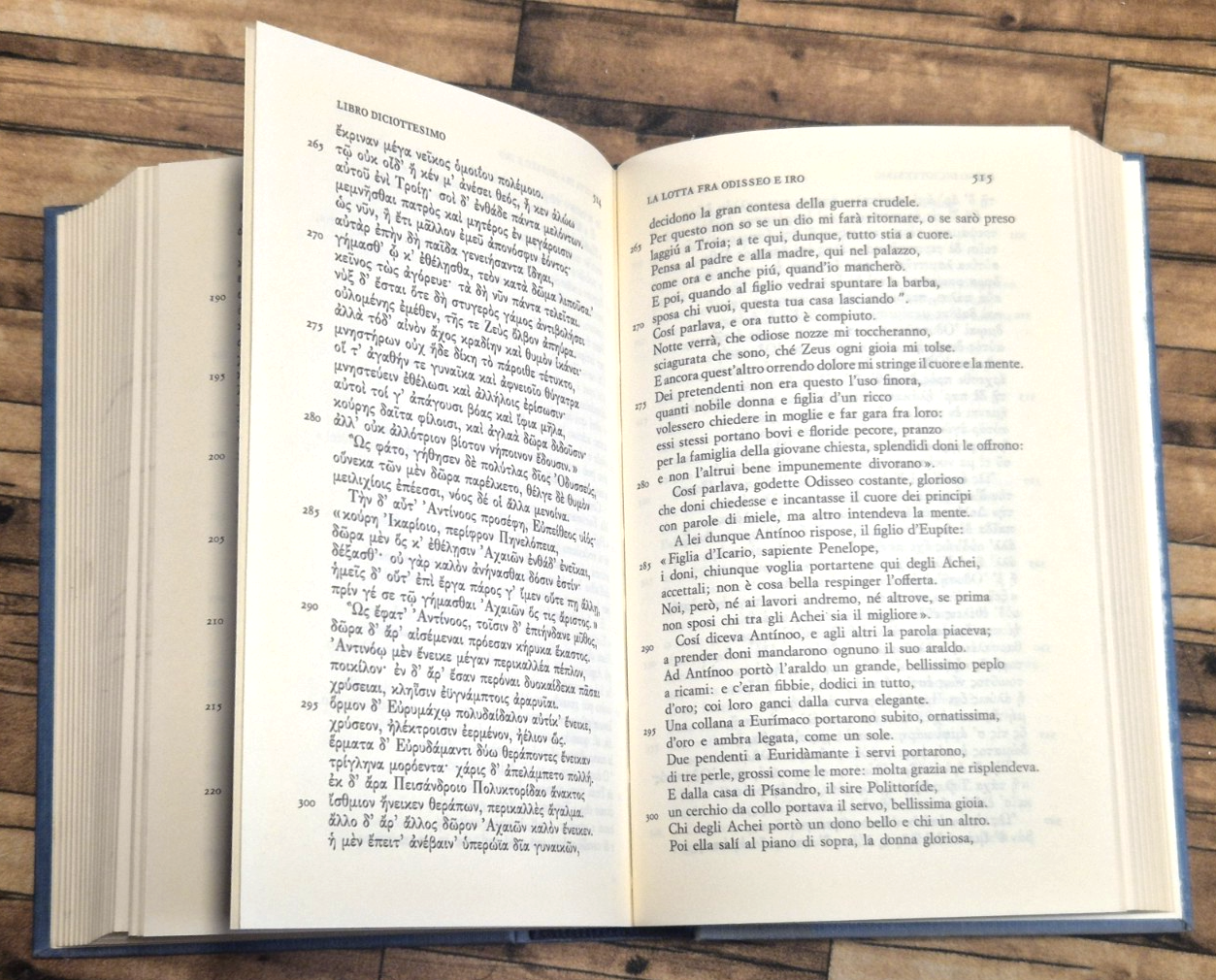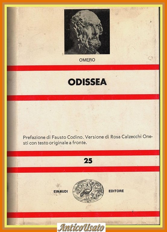 ODISSEA di Omero — Prefazione di Fausto Codino. Versione di Rosa Calzecchi Onesti con testo originale a fronte. Einaudi Editore, Nuova Universale Einaudi n. 25, 1991.XV + 716 pagine. Copertina editoriale in tela con sovraccoperta. Stato di conservazione: molto buono (pagine normalmente ingiallite).