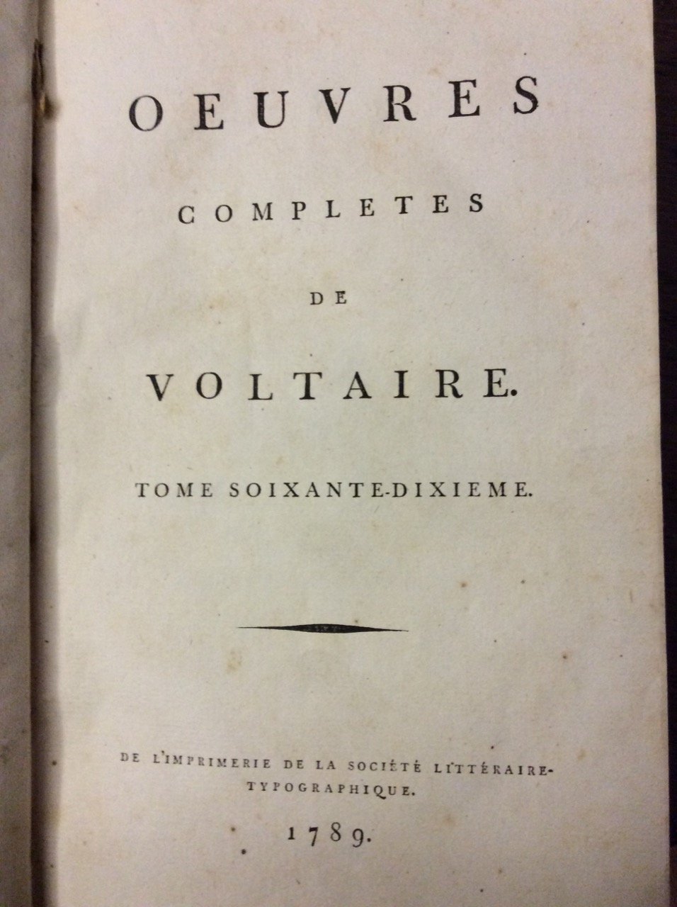 In-8 p. (mm. 202x126), 70 volumi, mz. pelle ottocentesca.Questa edizione è così suddivisa: Théatre (9 volumi) - La Henriade - La Pucelle - Poèmes - Epitres - Contes en vers - Lettres en vers et en prose - Essai sur les moeurs et l'esprit des nations (4 volumi) - Le siècle de Louis XIV (2 volumi) - Précis du siècle de Louis XV - Histoire de Charles XII - Histoire de l'Empire de Russie sous Pierre le Grand - Annales de l'Empire - Histoire du Parlement de Paris - Mélanges historiques (2 volumi) - Politique et législation (2 volumi) - Philosophie de Newton - Philosophie générale (4 volumi) - Dialogues - Dictionnaire philosophique (7 volumi) - Romans (2 volumi) - Facéties - Mélanges littéraires (3 volumi) - Commentaires sur Corneille (2 volumi) - Correspondence du Roi de Prusse (3 volumi) - Correspondence de l'Impératrice de Russie - Correspondence générale (13 volumi) - Correspondence de D'Alembert (2 volumi) - Vie de VoltaireCfr. Graesse,VII,390: Réimpression de l'édition de Kehl, 1784-89 (due à Beaumarchais), la plus complète et la mieux ordonnée qui eut paru jusqu'alors des oeuvres de Voltaire: on y a donné pour la première fois la volumineuse correspondance de l'auteur, ainsi que plusieurs pièces et autres morceaux curieux de théatre qui étaient restés inédits.. La réimpression de Basle contient une soixantaine de lettres en plus.. - Brunet,V,1355. Il volume dedicato alla vita di Voltaire è qui presente.Esemplare ben conservato.