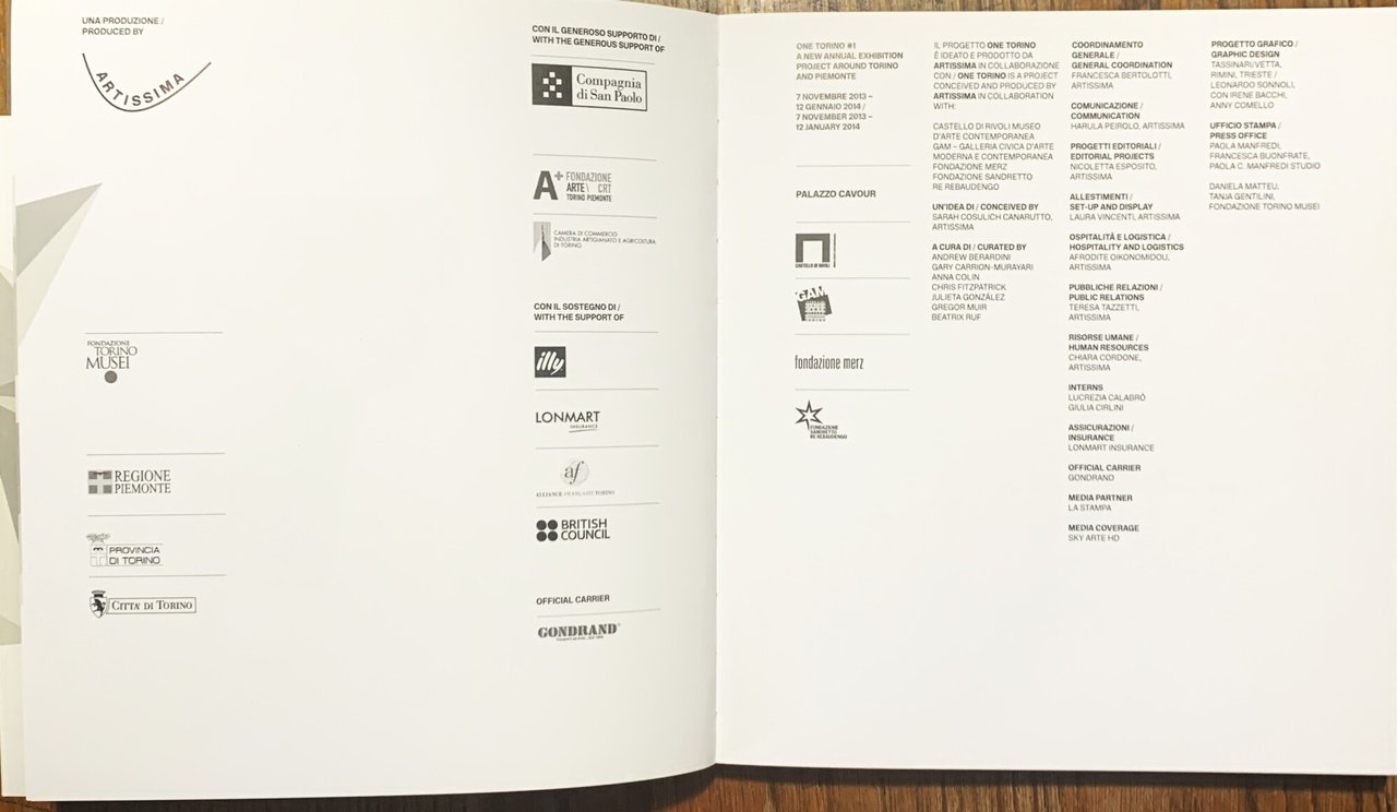 I ed.. Testo in italiano/inglese. Traduzioni/ Translations: Vincenzo Latronico. Catalogo della rassegna One Torino #1 (Artissima), Palazzo Cavour - Castello di Rivoli (TO) Museo d'Arte Contemporanea - GAM-Galleria Civica d'Arte Moderna e Contemporanea - Fondazione Merz - Fondazione Sandretto Re Rebaudengo, 7.11.2013 - 12.01.2014. VIII quasi quadro/ 200/ brossura in cartoncino liscio grigio con titoli in nero e ccon grafica grigio su grigio ai piatti (logo della nuova rassegna One Torino, ispirato al soffitto del Teatro Regio di Torino disegnato da Carlo Mollino)/ sovraccoperta parziale in carta liscia bianca con grafica in nero e nei toni del grigio (il logo della rassegna, come sopra). Illustrazioni in b/n e a colori. Design e impaginazione/ Design and layout: Tassinari/Vetta, Rimini, Trieste / Leonardo Sonnoli, con Irene Bacchi, Igor Bevilacqua. Stato buono (sovraccoperta leggermente polverosa). Sommario/ Contents: Prefazione/ Forewords; Patrizia Asproni - One Torino; Sarah Cosulich Canarutto - Repertory; Gary Carrion-Murayari (Palazzo Cavour) - Illy Present. Future Award Exhibition; Andrew Berardini-Gregor Muir-Beatrix Ruf (Castello di Rivoli Museo d'Arte Contemporanea) - Ideal Standard Forms; Anna Colin (GAM-Galleria Civica d'Arte Moderna e Contemporanea, Torino) - Ways of Working: The Incidental Object; Julieta Gonzáles (Fondazione Merz) - Veerle; Chris Fitzpatrick (Fondazione Sandretto Re Rebaudengo).