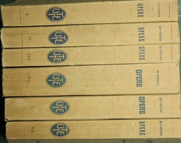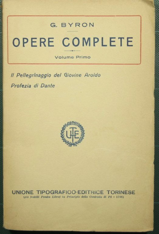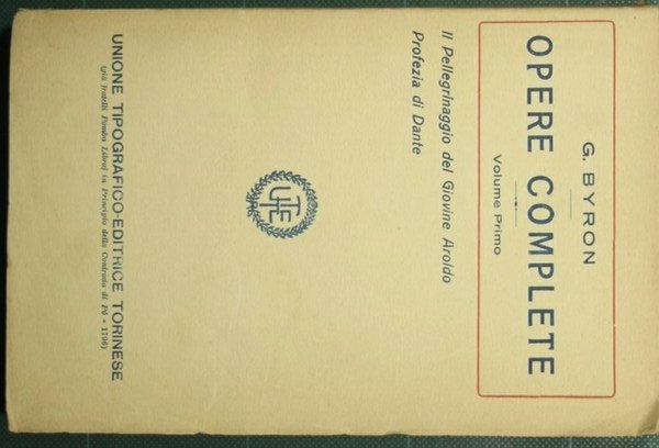 Collana Opere di cultura letteraria - in 16° - pp.410; 373; 349; 554; 438; 441-786 - Brossura editoriale - Sei volumi - Volumi I-IV-V-VI intonsi - Vol. I: Il pellegrinaggio del giovine Aroldo. Profezia di Dante; Vol. II: Poesie varie; Vol. III: Manfredo. Caino. Sardanapalo. Marin Faliero. I due Foscari; Vol. IV: Don Giovanni. Beppo. La visione del Giudizio. L'età di bronzo; Vol. V: Componimenti varii; Vol. VI: Componimenti varii
