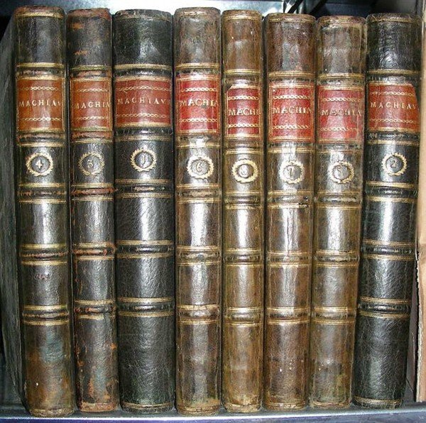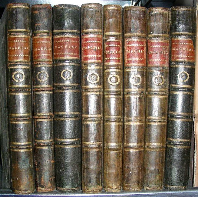 8 voll. in-8 gr., pp. CLXXXIV, 276; 452; 325; 385; 364; 369; 419; 323, bella leg. unif. m. pelle coeva con angoli, tass. e tit. oro ai d. con nervi e picc. fregi oro, piatti in carta marmorizz. In antip. al primo vol. bel ritr. del Machiavelli inc. in rame da Lapi dal dipinto del Bronzino. Con una tab. rip. con il raffronto di alcuni passi dell’opera con altre edizioni. Rara ediz. ampliata rispetto a quella precedente del Cambiagi del 1782. Bell’esempl. [254]