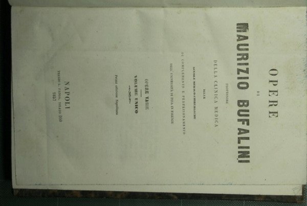 Opere varie. Volume unico. Prima edizione napolitana - in 8° - pp.VIII + 446 - Mezza pelle con titolo e fregi in oro al dorso - Tagli spruzzati. Testo su due colonne - Mancanza al dorso