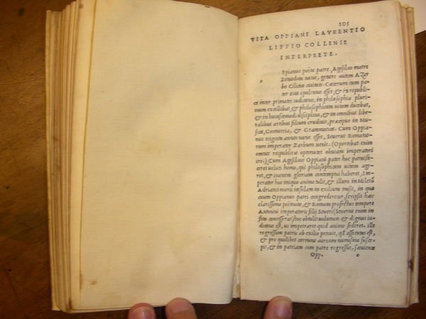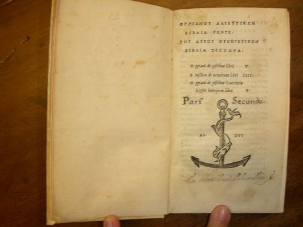 OPPIANOU ALIEUTIKWN BIBAIA PENTE. TOU AUTOU KUNHGETIKWN BIBAIA TESSAPA. [testo greco] Oppiani de piscibus libri V. Eiusdem de venatione libri IIII. Oppiani de piscibus Laurentio Lippio interprete libri V.