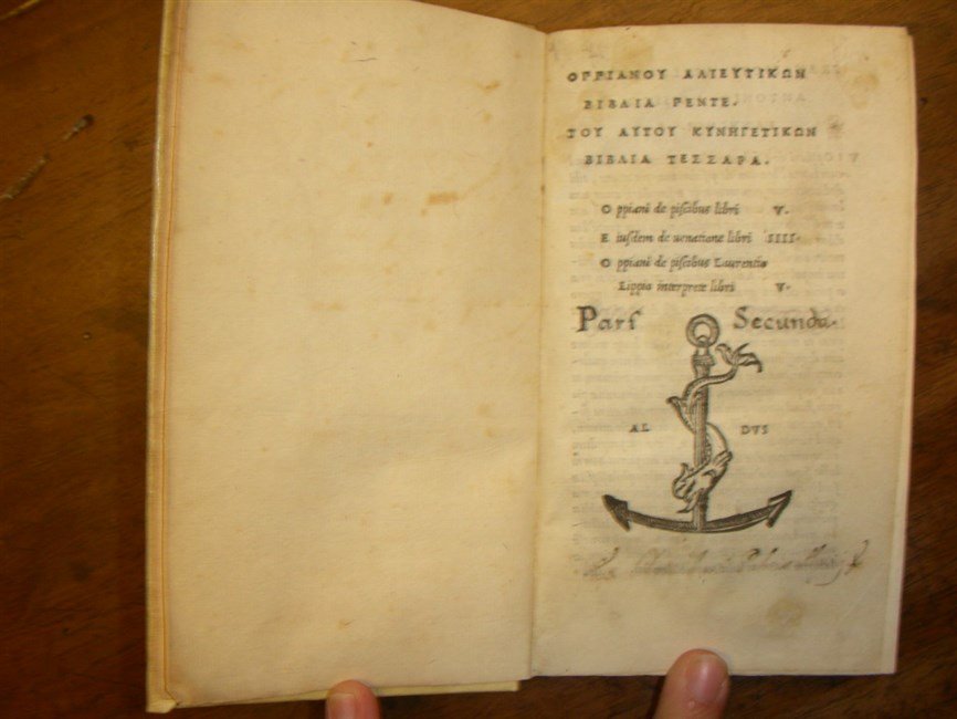 in-8 antico, 1 cb, cc 168, 1 cb, rileg. in perg. molle antica rimontata, con tracce di doratura ai tagli. Marca tipogr. in legno al front. e ripetuta al colophon. Editio princeps per l'opera sulla caccia e seconda edizione per il trattato sulla pesca, entrambe versate in latino per opera di Lorenzo Lippi, umanista toscano. Testo preceduto dalle prefazioni di Francesco Asolano e da una succinta, e anonima, biografia di Oppiano con testo greco. I due trattati, sulla pesca e sulla caccia, furono ritenute opere dello stesso autore fino alla fine del Settecento quando lo studioso J. G. Schneider stabilì nella sua edizione delle opere del 1776 che questi due poemi non erano stati composti dallo stesso individuo ma da due persone omonime confuse costantemente nei secoli. Per questo motivo i due poemi furono quasi sempre stampati uniti (tranne che nell'edizione della Alieutica di Firenze, Giunti, 1515). In particolare lo scrittore della Alieutica nacque in Cilicia all'inizio del II sec. Il poema composto da più di 3000 esametri e diviso in cinque libri tratta dalla storia naturale dei pesci e in particolare negli ultimi 3 libri dell'arte della pesca, dando prova di molte cognizioni zoologiche ma anche dando credito a molte favole e assurdità che sono per noi oggi forse la parte più piacevole del poema stesso. Dal punto di vista stilistico l'Alieutica è superiore al poema sulla caccia e anche questo dato fa comprendere come sia impossibile ricondurre le due opere alla stessa mano. L'autore della Cinegetica, composta da circa 2000 esametri in quattro libri, era nativo di Apamea in Siria, e nonostante la "durezza" dello stile e della lingua, anche in questo caso sono notevoli i riferimenti zoologici. Antica annotazione coeva ad inchiostro al front. che cita "Pars Secunda". Freschissimo esemplare ad ampi margini di rarissima edizione aldina. Adams O-200. Renouard p. 81, n. 9. BLSTC p. 476. Ottimo esempl. [191]