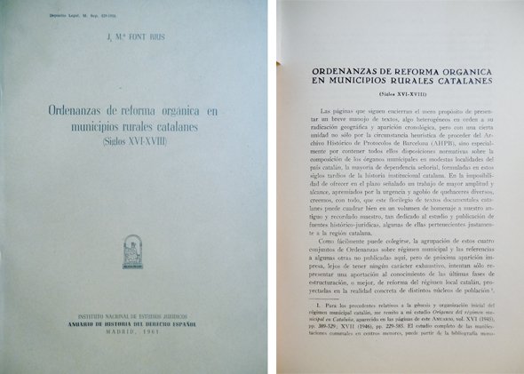 Ordenanzas de reforma orgánica en municipios rurales catalanes durante los Siglos XVI al XVIII. | Rare and modern books | Font Y Rius, José María.
