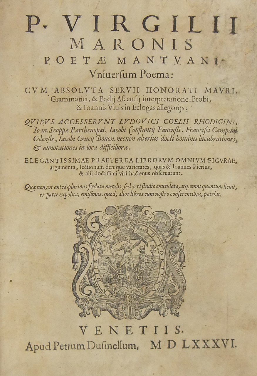 P. Virgilii Maronis poetae Mantuani Uniuersum poema: cum absoluta Servii Honorati Mauri, Grammatici, & Badij Ascensij interpretatione: Probi, & Ioannis Viuis in Eclogas allegorijs; quibus accesserunt Ludovici Coelii Rhodigini, Ioan. Scoppae Parthenopaei, Iacobi Constantij Fanensis, Francisci Campani Colensis, Iacobi Crucij Bonon. necnon alterius docti hominis lucubrationes, & annotationes in loca difficiliora. Quae non, ut antea, plurimis foedata mendis, sed acri studio emendata, atq. omni quantum licuit, ex parte expolita, emisimus. quod, alios libros cum nostro conferentibus, patebit | Rare and modern books | Vergilius Maro Publius - Virgilio Marone