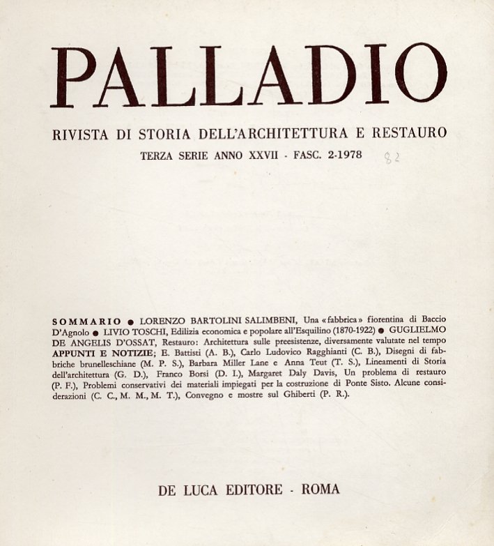 Roma, 1978; br., pp. 84, 21 ill. b/n, cm 22x24. (Palladio. Rivista di storia dell'architettura e restauro. Terza serie. Anno XXVII. Fascicolo 2. 1978).