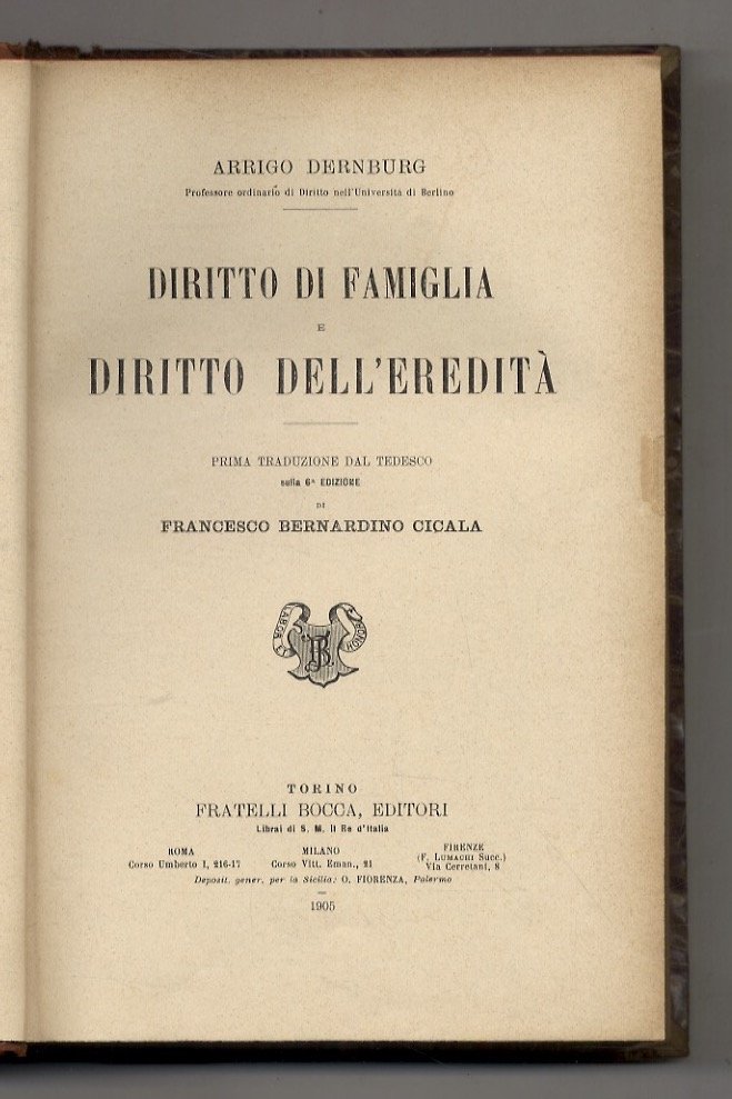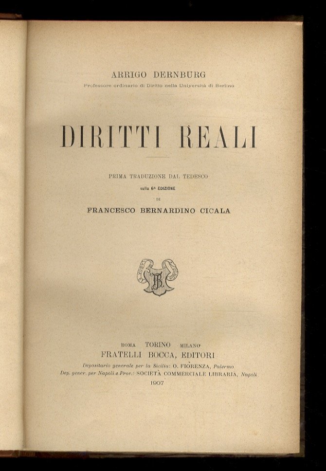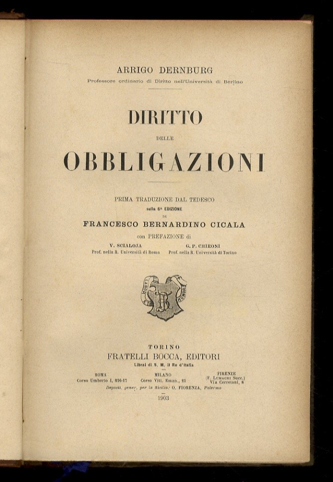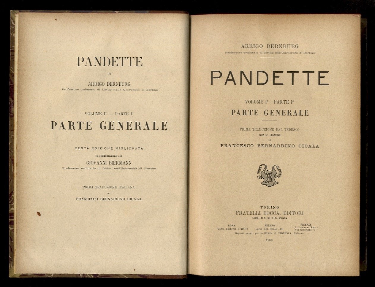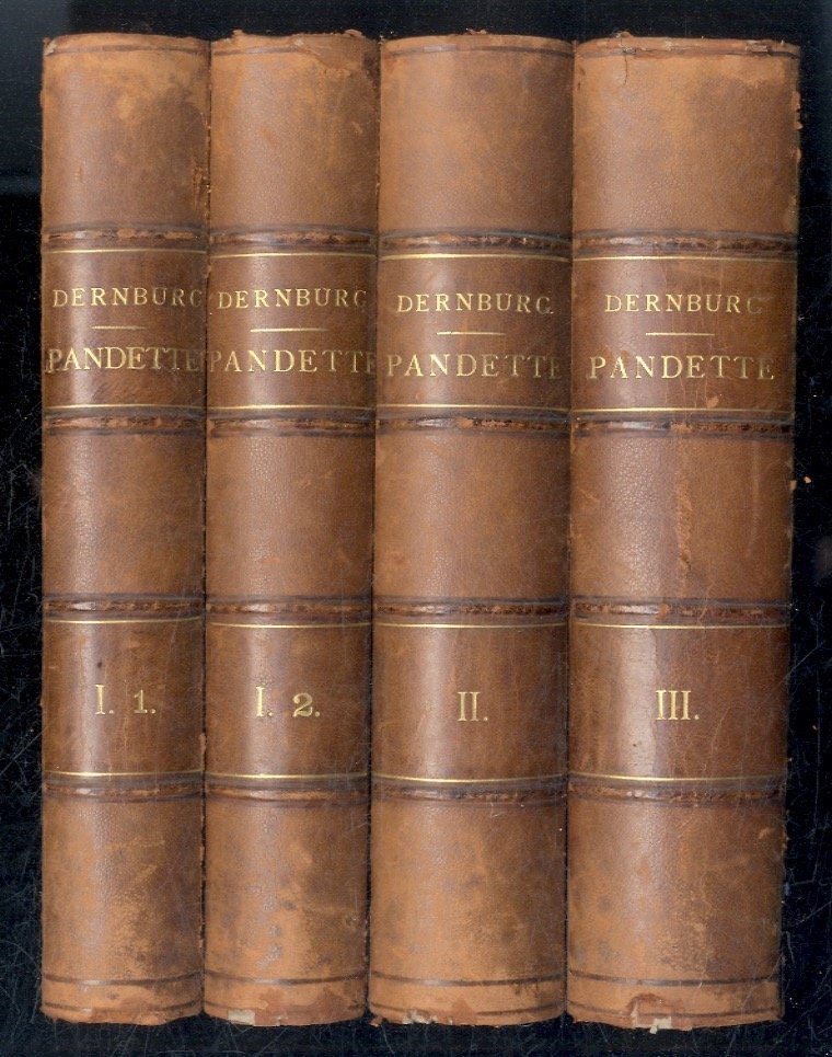 Torino, Fratelli Bocca Ed., 1903 - 1907, volumi 3 in 4 tomi, in-8, legatura di poco successiva in mezza pelle, dorsi a 4 nervi con iscrizioni in oro, tagli superiori rossi, pp. XVIII, 536 - XI, 521 - X, 649 - XII, 778. Edizione italiana completa delle "Pandette" di Dernburg. Ex-libris e firme di possesso di Filippo Vassalli. Spellature e piccoli difetti ai dorsi; l'interno ottimo. Buon esemplare.