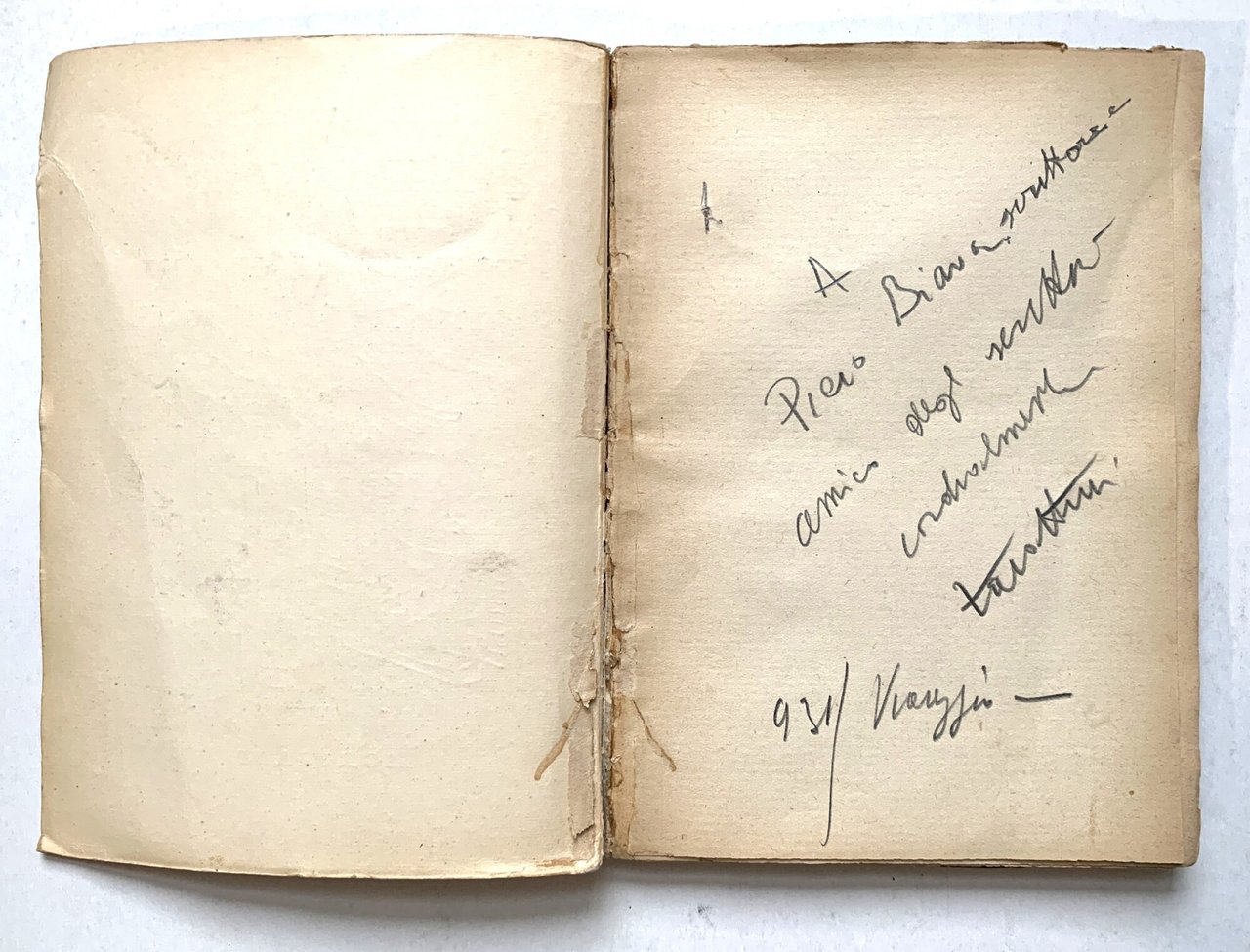 I ed.: 18 Luglio 1931. Edizione "La Zattera"-"Italiani", vol. 2. XXIV/ 124/ brossura in cartoncino liscio avorio ccon titoli in nero e con illustrazione in nero al primo piatto. Con un disegno in nero dell'A. f.t.. Ap. 1, pagina non stampata, dedica a matita dell'A.. Stato buono (usura e brunitura della copertina - piccole fioriture in copertina - allentamento della rilegatura - pagine brunite).