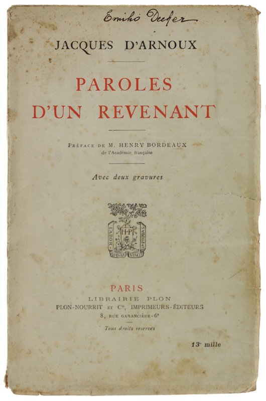 PAROLES D'UN REVENANT. Avec deux gravures. | Rare and modern books | D'Arnoux Jacques.